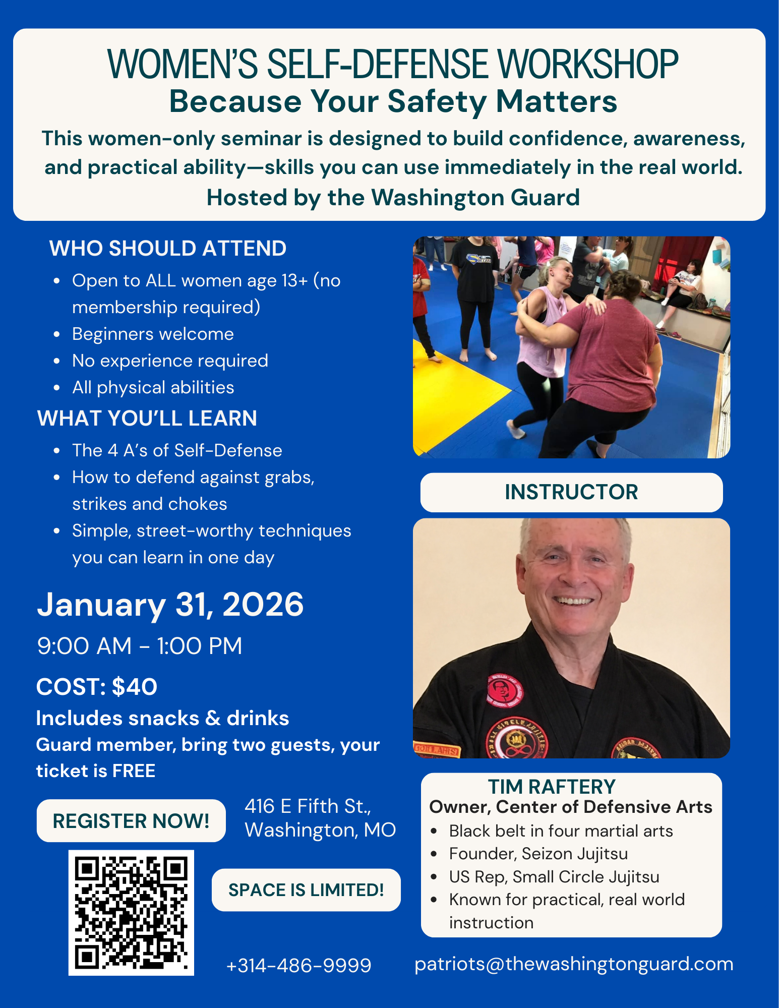 This women-only seminar is designed to build confidence, awareness, and physical ability ---